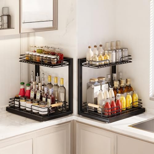 Under Sink Organizers, 2 Tier Under Sink Organizers and Storage, Under Sink Storage Shelves Metal Sliding Drawer for Kitchen Pantry Cabinet Closet, Black 2 Pack