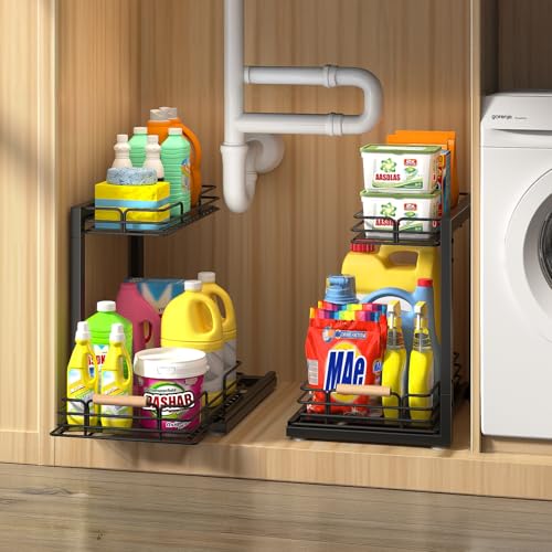 Under Sink Organizers, 2 Tier Under Sink Organizers and Storage, Under Sink Storage Shelves Metal Sliding Drawer for Kitchen Pantry Cabinet Closet, Black 2 Pack